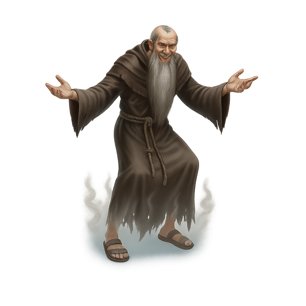 Une silhouette haute, austère, vêtue d’une aube brune élimée par les siècles. Une longue barbe grise coule sur sa poitrine. Son visage émacié, creusé par l’inquiétude, les fixe d’un regard intense. Et lorsqu’il ouvre la bouche, un cri rauque, presque inhumain, éclate dans le couloir :