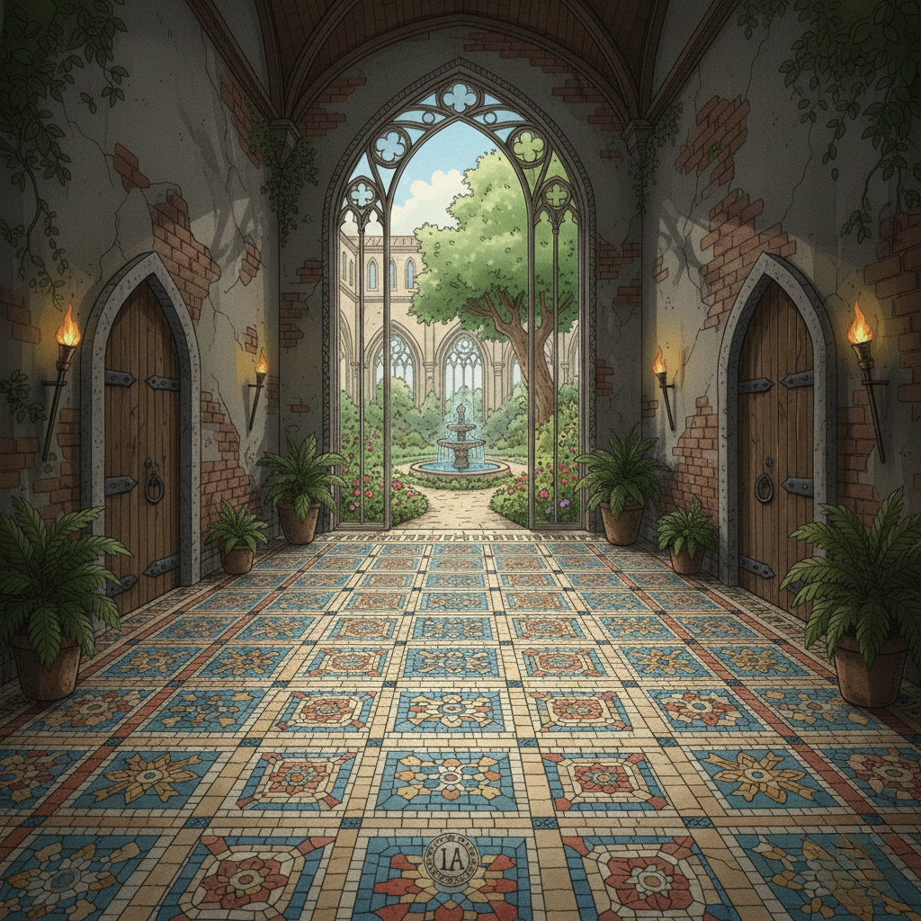 Au centre du hall, un blason au sein d’une mosaïque semble éclairé par-dessous. Ils s’approchent, presque en apnée. Au milieu du blason, gravées dans la pierre polie, deux lettres reviennent une nouvelle fois : I A