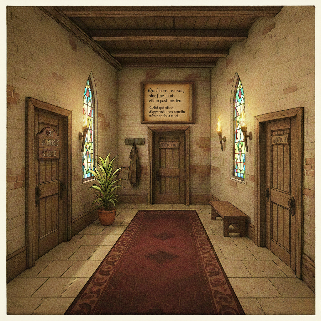 C’est alors que leurs regards montent vers la grande plaque suspendue au-dessus de la porte centrale. Gravée dans le bois sombre, une citation en latin domine le couloir :