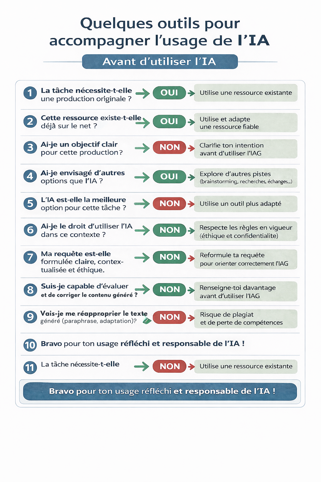 - Ma manière de procéder avant, pendant et après mon utilisation de l’IA, favorise-t-elle me développement de mes compétences transversales ?