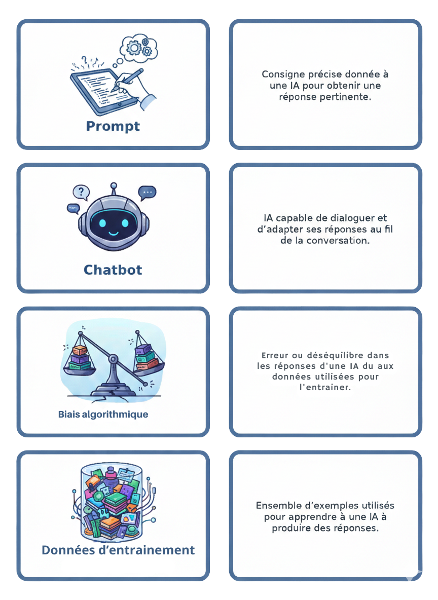 L’IA peut : générer des questions de définition, varier les niveaux de difficulté, reformuler les notions clés, créer des pièges fréquents, proposer des auto-tests rapides