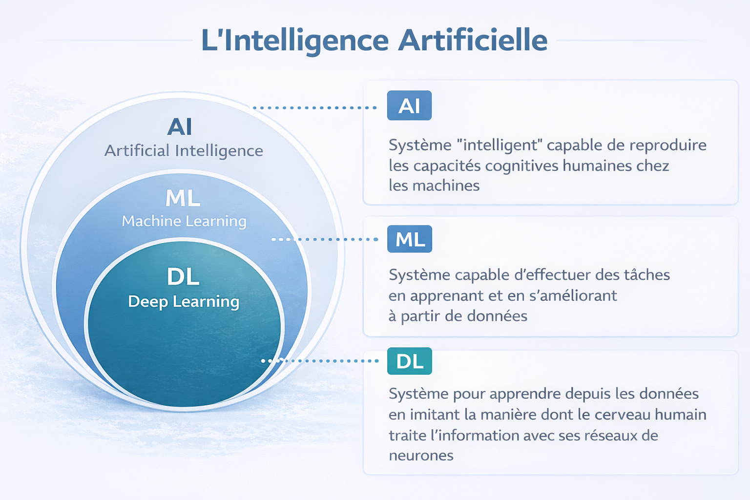 Pour comprendre simplement ce qu’est l’intelligence artificielle et comment elle fonctionne, il est utile d’en présenter les principes fondamentaux à travers trois notions clés : l’apprentissage, le modèle et la génération.