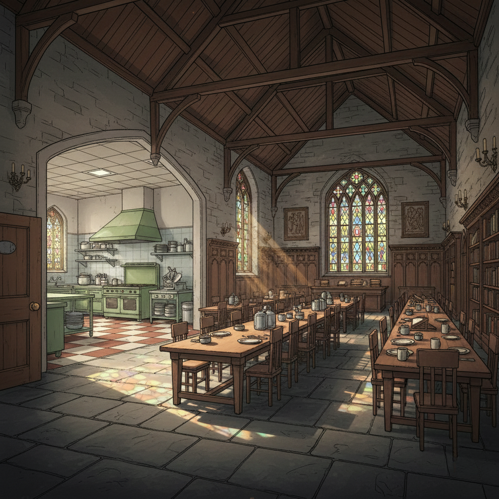 C’était un petit réfectoire chaleureux, presque intime, aux cloisons recouvertes de palissades de bois, taillées et sculptées finement. De petites gravures représentant des scènes bibliques ou des moments de la vie quotidienne des frères.